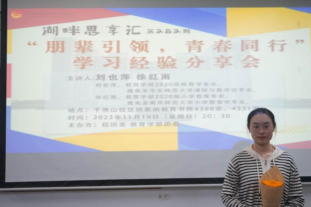 11月19日,由校团委、教育学部团委联合举办的“湖畔思享汇”第282期“朋辈引领,青春同行”学习经验分享会在千佛山校区田家炳教育书院4308室、4331室举行。本次分享会邀请成功推免的教育本2001刘也萍、小教综2001徐红雨主讲,教育学部各年级300余名同学积极参与,现场气氛活跃。